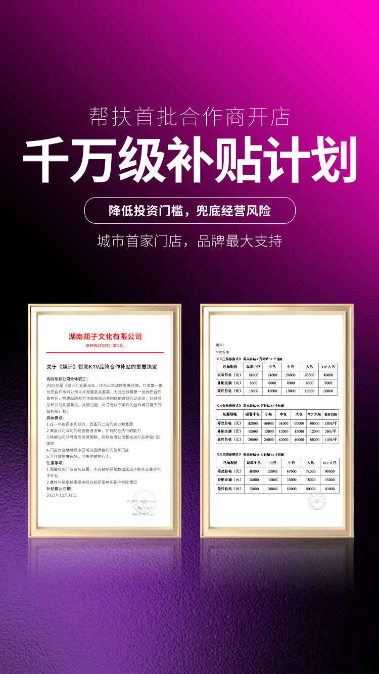 《娱计》品牌隶属于湖南胡子文化有限公司是一家以智助KTV为主营业务并融合台球、棋牌的综合型娱乐文化公司,公司以和意向投资者合作,搭建门店体系、落地成熟门店、代运营管理门店获取利润的方式,构建和加盟商的命运共同体,实现门店和公司的共同发展。